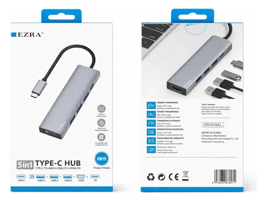 Adaptador Hub USB-C 5 en 1 UH15 con salida HDMI, puertos USB y carga. Ideal para ampliar la conectividad de notebooks, tablets y celulares de forma práctica y portátil.
